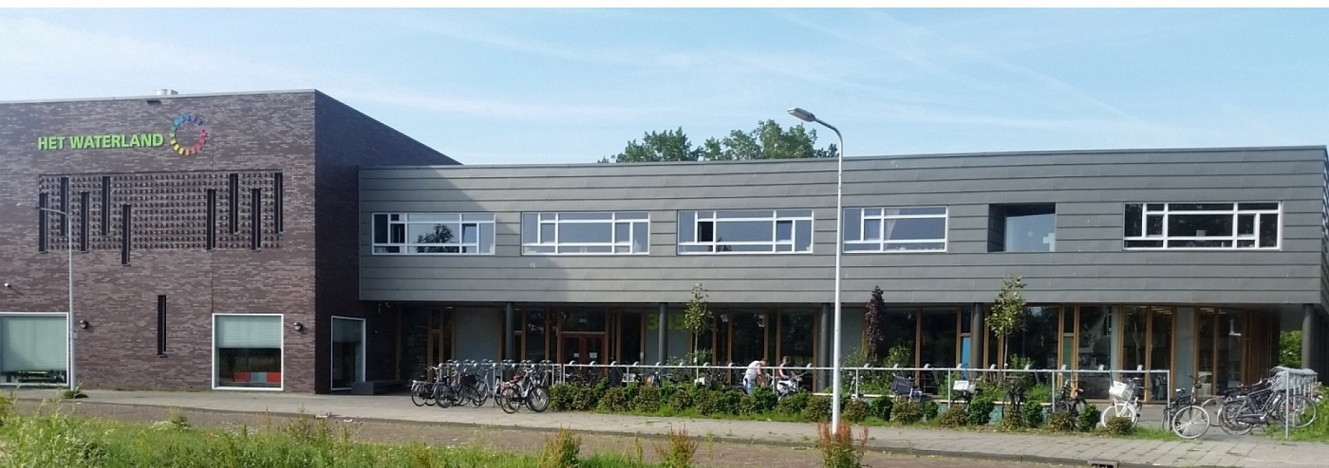 Achter de school zijn parkeerplaatsen (betaald parkeren) en rondom de school staan fietsenrekken.